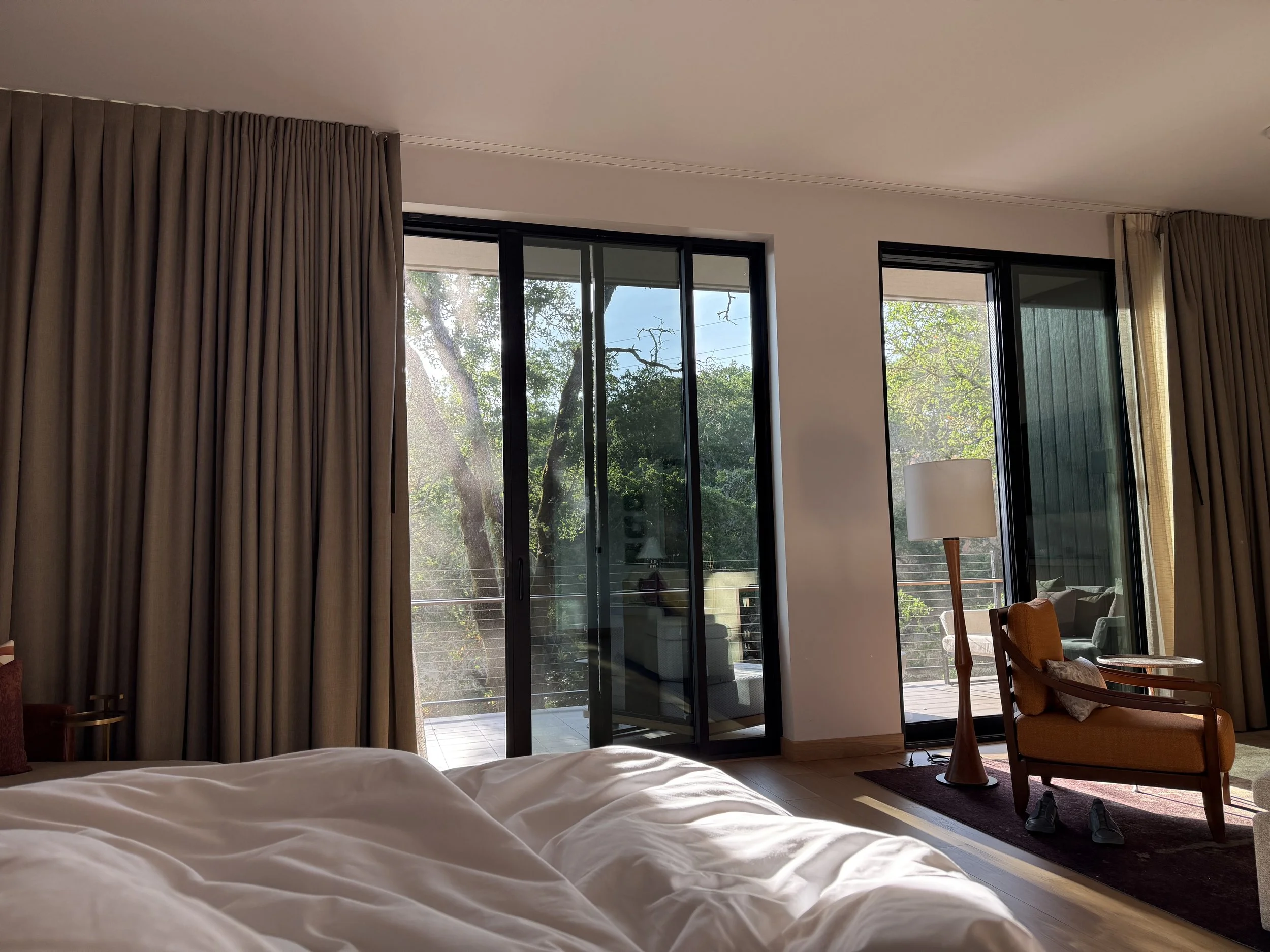 We stayed in a Forest View room and honestly, I’d choose it again over the vineyard view, which is technically a higher room category and typically more sought after. The room sits elevated among the trees, so when you step out onto the deck, it feels like you’re suspended in the canopy, surrounded by soft green moss and filtered sunlight. The sliding glass doors open completely, and we left them open for most of the day to enjoy the weather. Montage does everything with quiet precision such as their room product, and the bathrooms here are no exception: spacious, thoughtfully designed, and featuring one of my favorite details, an outdoor shower.